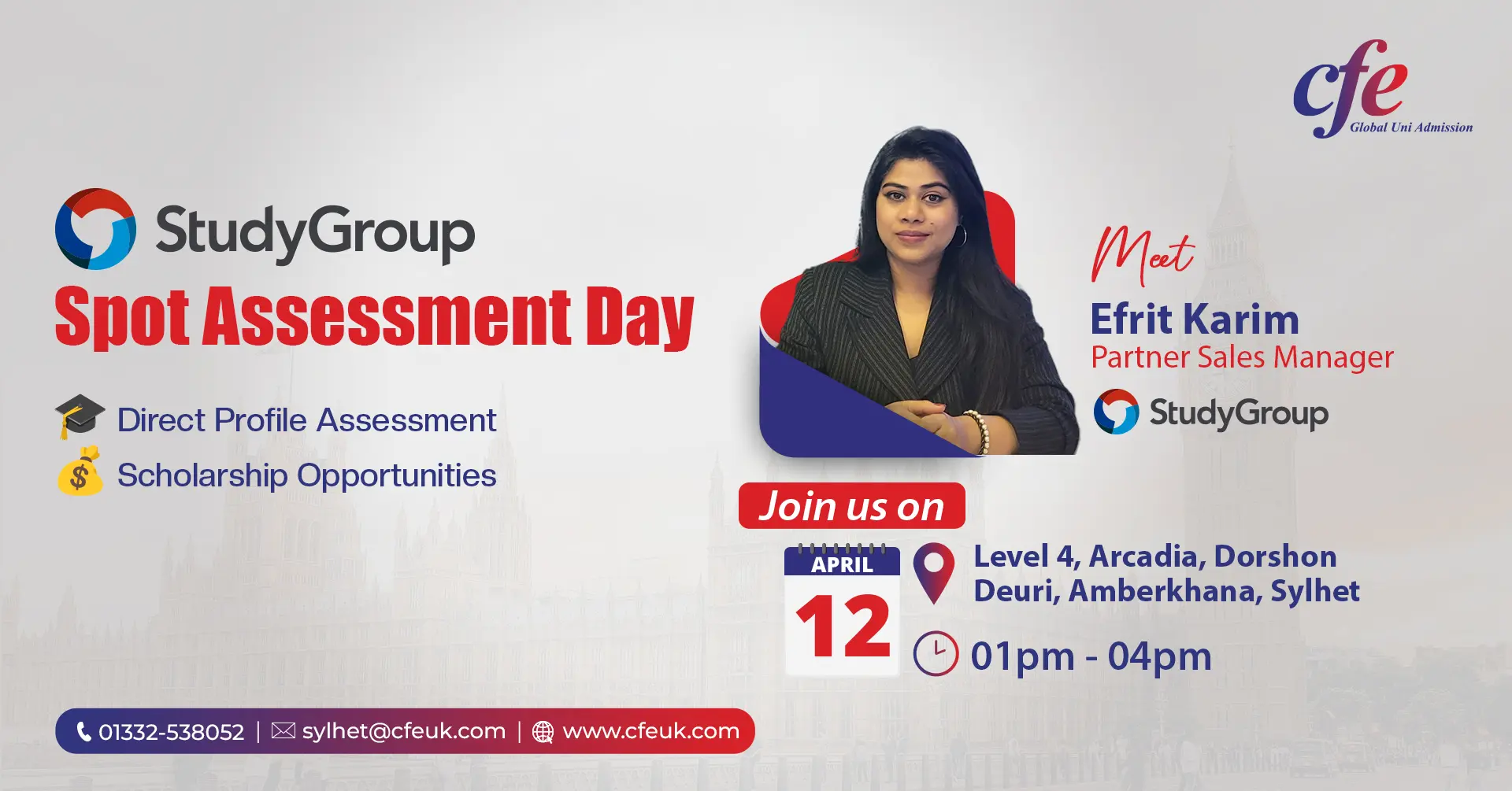 Centre for Education (CFE) is excited to host an exclusive Spot Assessment Day in Sylhet in collaboration with Study Group, a globally trusted international education provider.